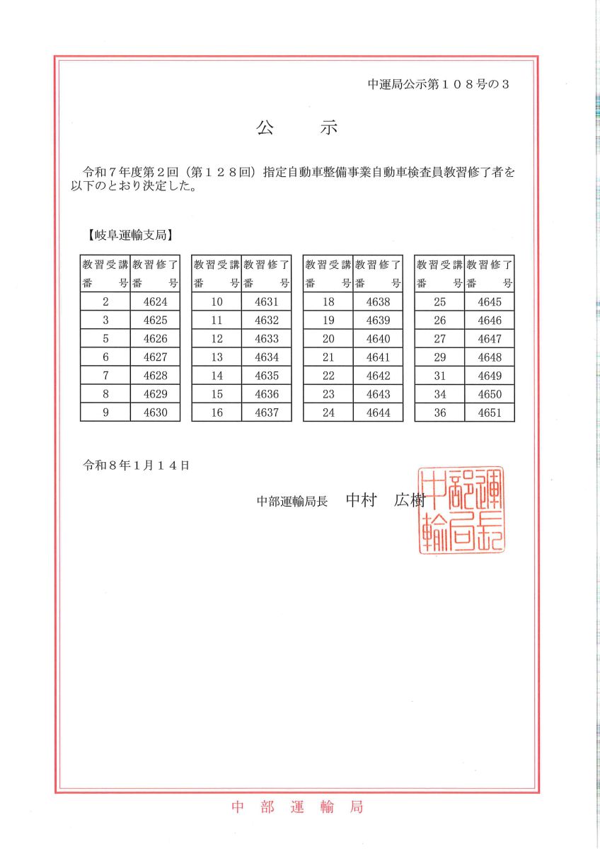 第128回指定自動車整備事業自動車検査員教習修了試問の結果について
