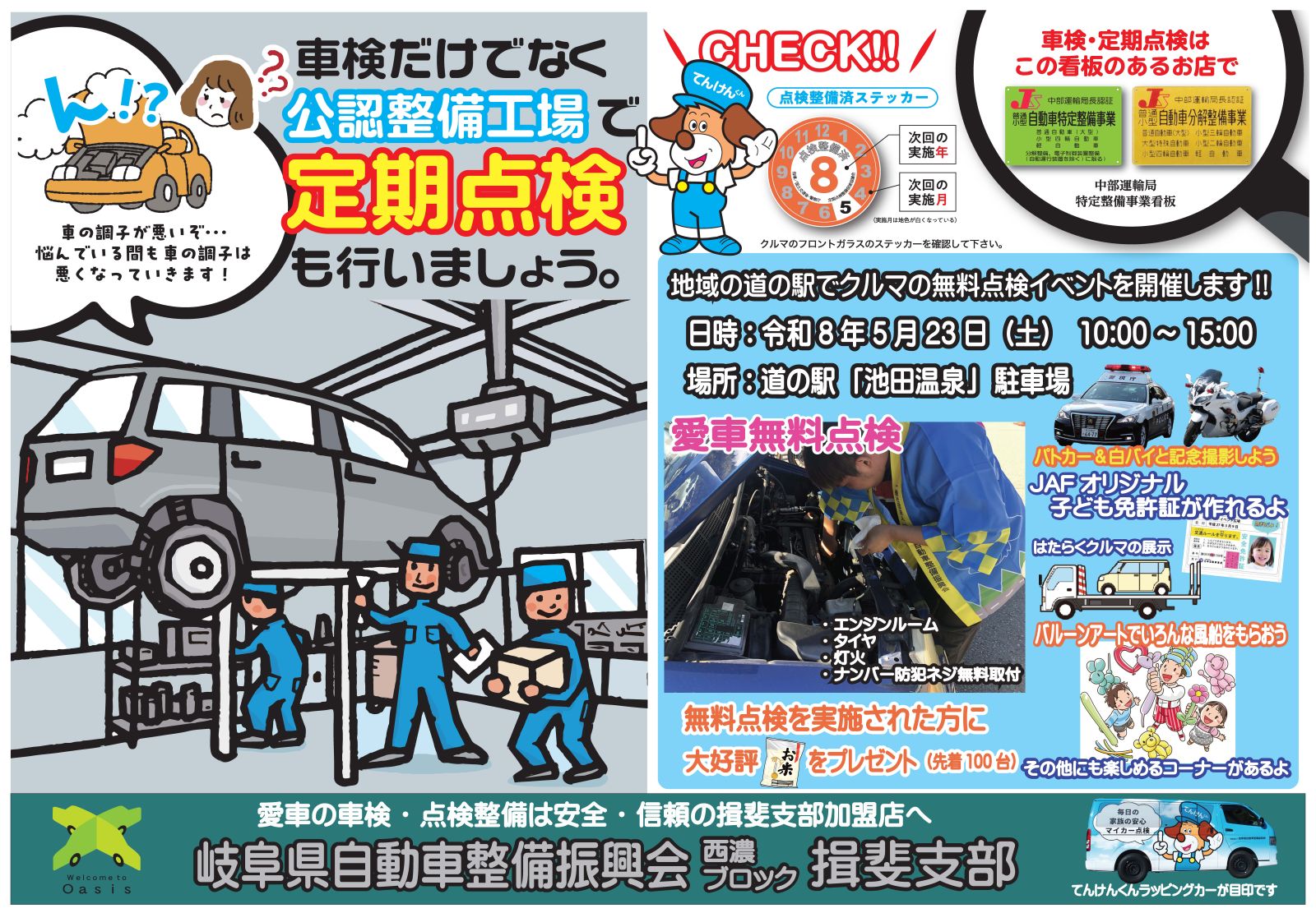 令和8年5月23日(土)に道の駅池田温泉において、岐阜県自動車整備振興会揖斐支部主催の愛車無料点検を実施します。