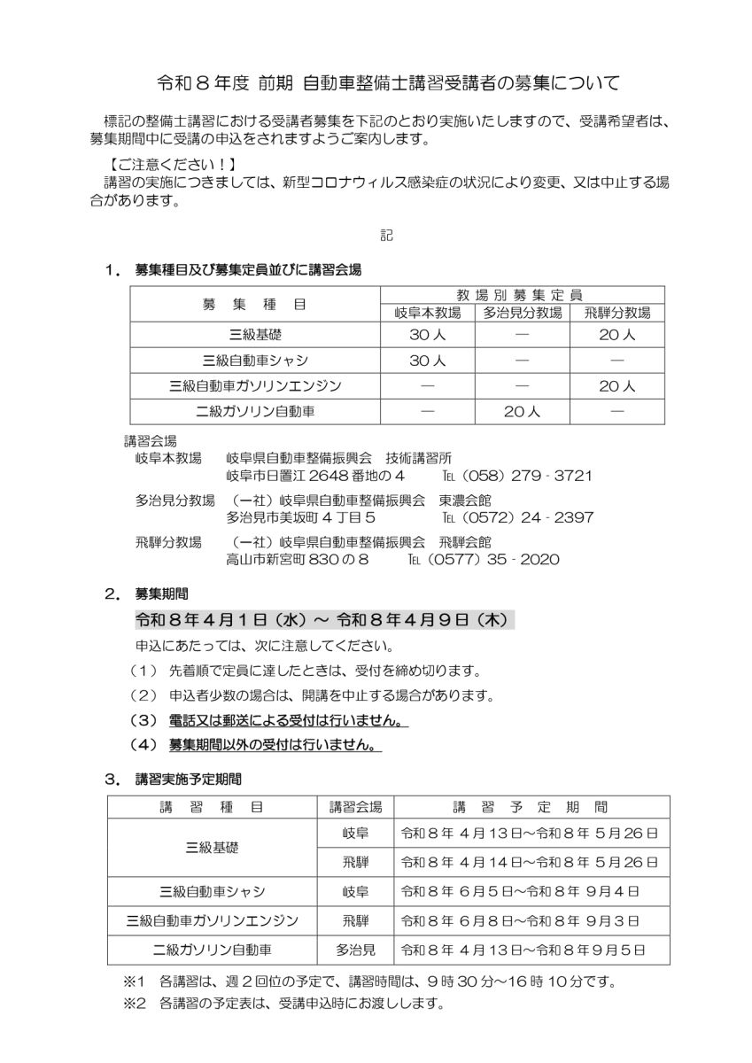 令和8年度 前期 自動車整備士講習受講者の募集について|一般社団法人 岐阜県自動車整備振興会